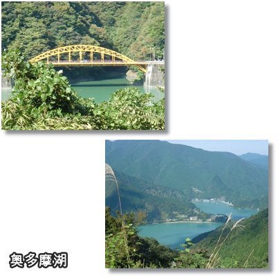 周遊道路 奥多摩ゲート入ってすぐの場所で撮った黄色い橋と月夜見第一駐車場で撮った奥多摩湖 (http://www.l0ft.com/motorcycle/okutama/)