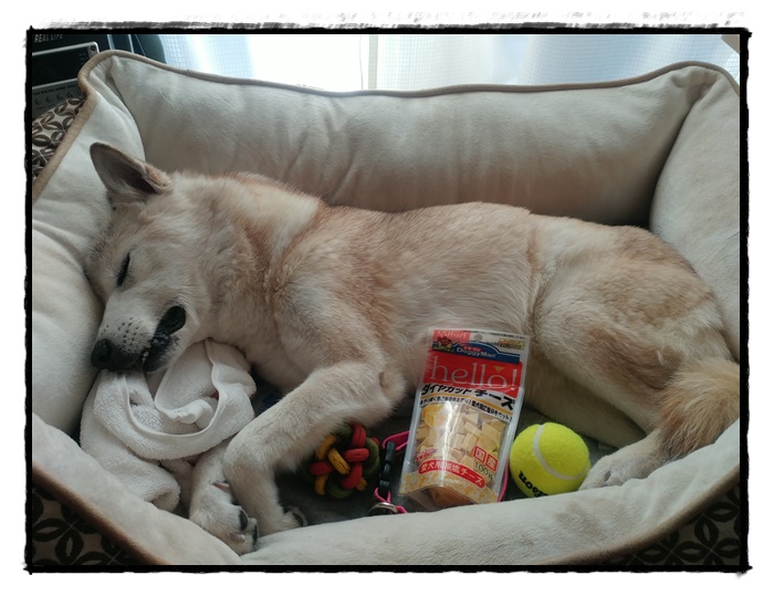 心停止後キレイにドライシャンプーで拭いてあげていつも使っているベッドに寝かせ好きなおもちゃ・おやつと一緒に。