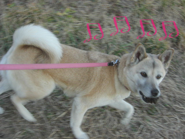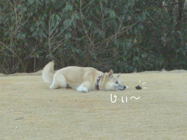 この訳の分からない物体、相当お気に入りのようで芝生から離れる際にすかさず咥えてお持ち帰り。