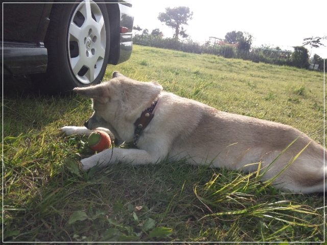 で、グイグイ車のほうへ導くんだけどいざ車の前に来ると拾ったボールを吟味しはじめる。