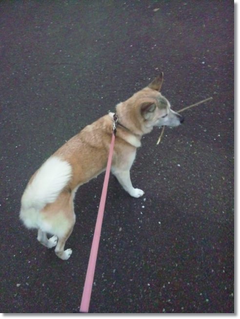 そらが枝を咥えてるのを忘れてリードを縮めてしまうと枝がワタシの足にガシガシ当たって痛いのよ~~~(TOT)