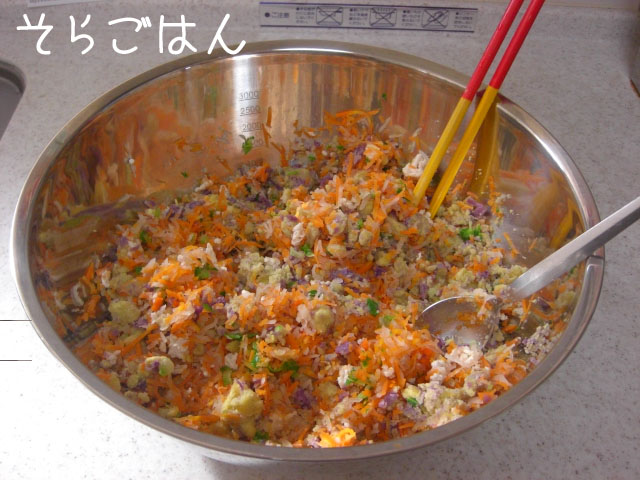 ニンジン・大根をスライサーで千切りに茹でたものと蒸かしたサツマイモ・さっと湯がいた鶏ひき肉をまぜまぜ。