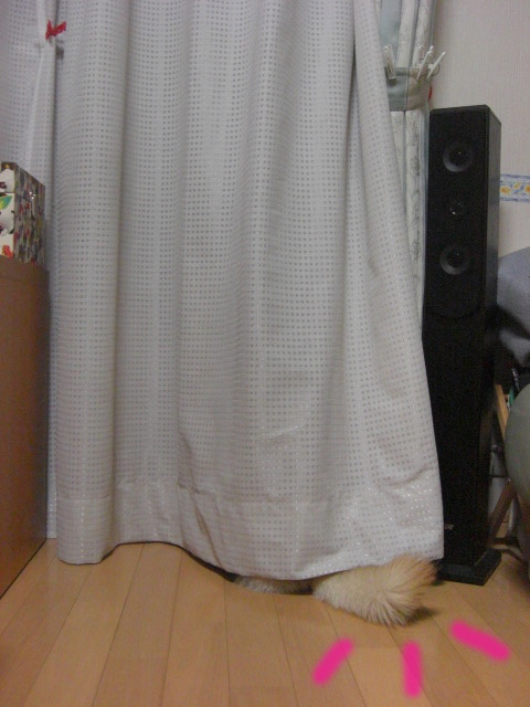 この時夕飯の支度してて、ふと振り返ったらそらが居ないので探そうと思ったらカーテンに尻尾が生えていたのでぶふっ!と噴出しそうになりました( ̄m ̄〃