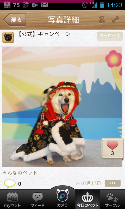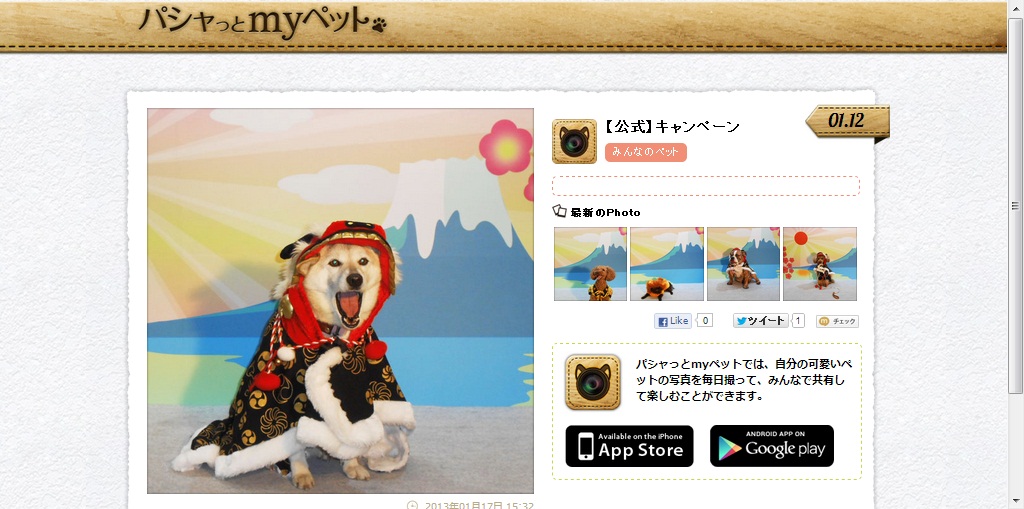 スタッフの方が三脚に取り付けたデジカメで撮ってくれてて「これは後日アプリにUPします~」っていうのを「パシャっとmyペット」というスマホアプリをDLするとプレゼントが貰えるとのことだったので早速DLして可愛いお散歩トートバッグをげっと!