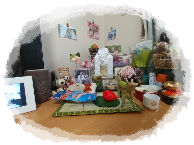 上の写真はお盆用に色々飾ったからお線香立てが結構手前だけど本来はもっと奥に置いてたの。